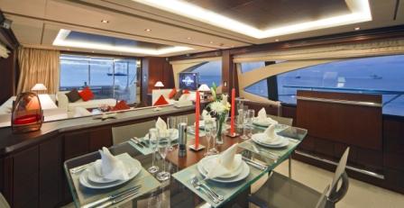 This flybridge yacht is large and the perfect place to relax as it boasts a large Spa Pool, a bar, and an al fresco dining table making it a great area to relax during the night or day.