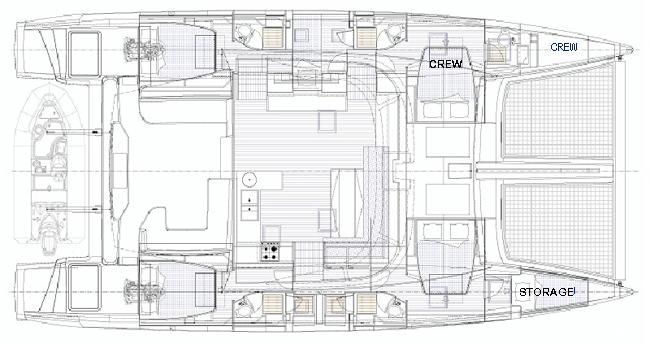 Guest accommodation is in the port and starboard hulls, boasting a versatile 4 double, or 3 double and one bunk cabin layout.
