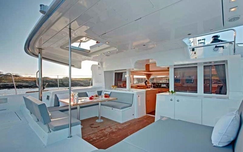 The galley sits to port and offers direct access to the cockpit, perfect for alfresco or formal dining service. Guest accommodation is fore and aft, in the port and starboard hulls, each cabin with a queen size bed and private en-suite facilities.