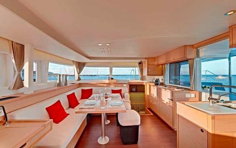 The salon and dining is an open plan, featuring a generous L shaped sofa, seating and adjustable dining table. The galley sits to port and offers direct access to the cockpit, perfect for alfresco or formal dining service.