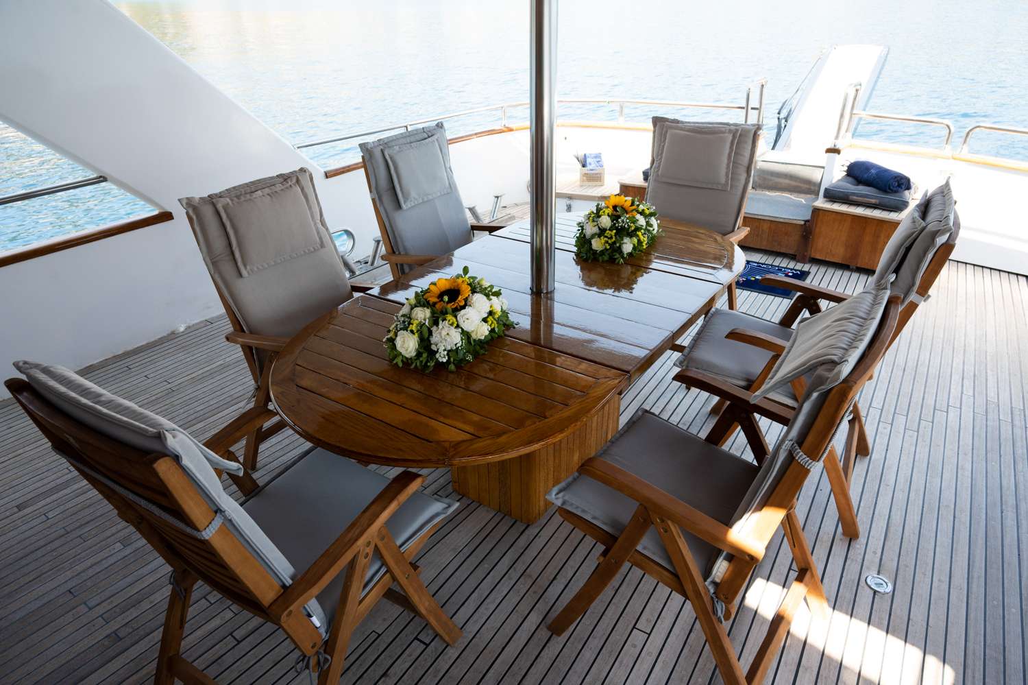 The salon and dining are on the main deck with the comfortable lounge aft and formal dining forward. Further forward, the VIP cabin offers a full beam layout, with double bed. Below decks are the full beam master cabin and 4 twin cabins, each with side by side single beds.
