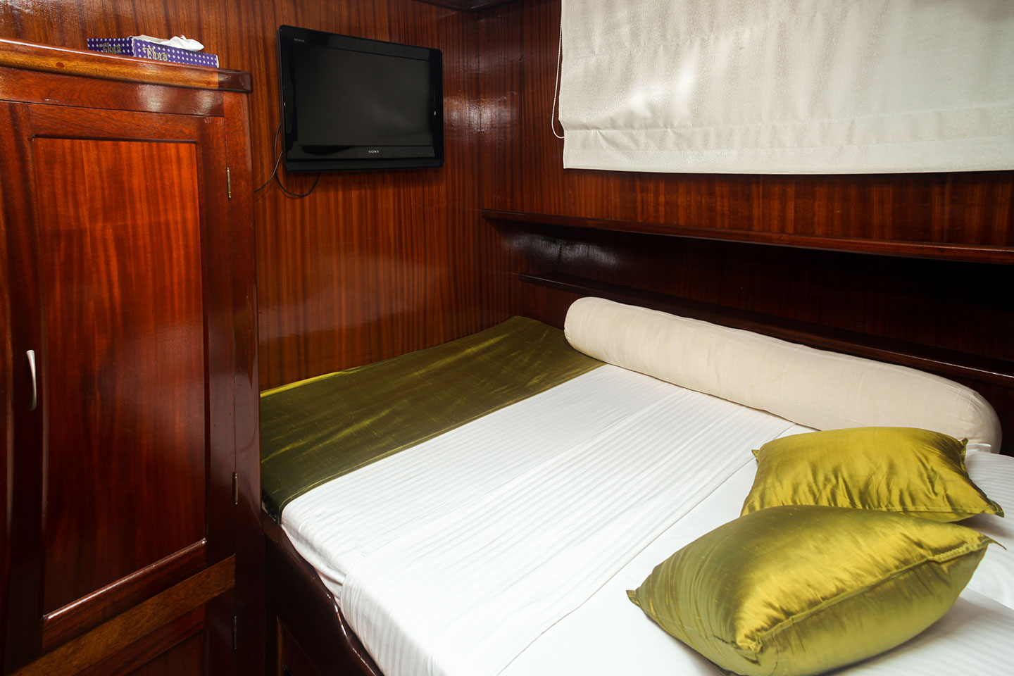 The salon boasts a comfortable lounge area, wet bar and TV entertainment. Guest accommodation is below decks, in 6 double en-suite cabins, each cabin with full air conditioning and TV entertainment.