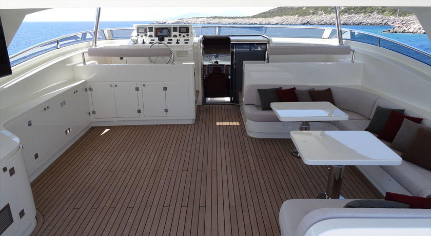 Exterior living is plentiful with fine teak decks. The aft deck is shaded and offers an alfresco dining option and seating.