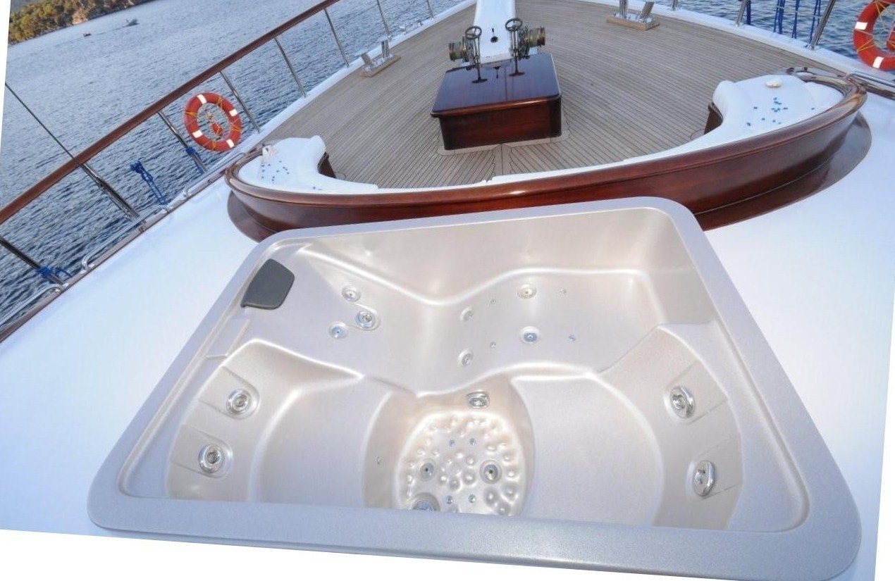 The aft deck is spacious, offering shade, an alfresco dining option and 2 massive aft sunpads. The full teak decks wrap around the yacht, providing effortless access to the foredeck. The foredeck boasts raised sunpads for the sun worshipers, a casual alfresco dining area and deluxe hot tub.