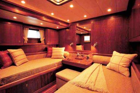 In total, this Greek crewed charter yacht sleep 6 guest is 3 spacious double cabins. The master cabin, located aft has a queen size bed and a lounge area with a writing desk. The master cabin also has satellite TV, DVD and video. The second and third cabins are twin bedded cabins.