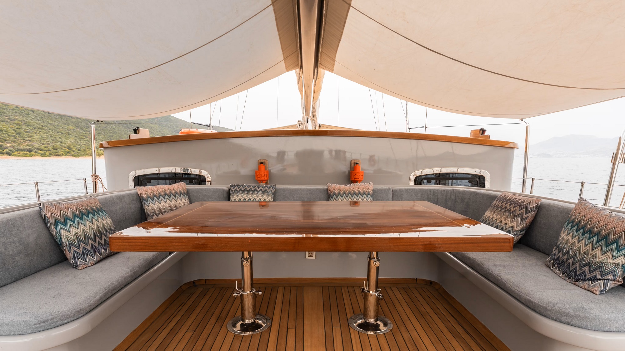 The sailing yacht LE PIETRE features a modern chic interior of pale oak panels, dark wood floors and earthy toned soft furnishings, creating a welcoming elegant ambience.