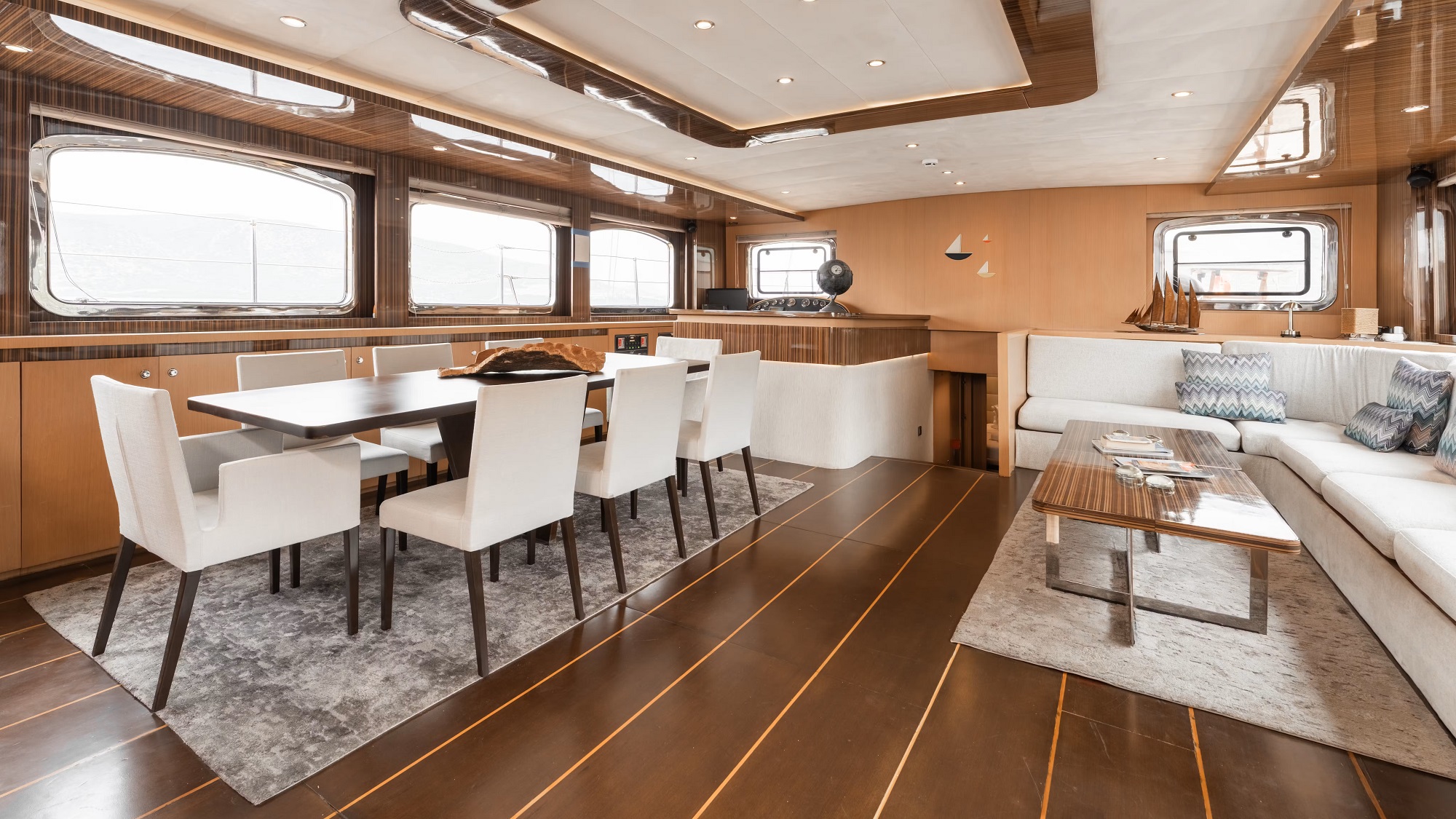 The sailing yacht LE PIETRE features a modern chic interior of pale oak panels, dark wood floors and earthy toned soft furnishings, creating a welcoming elegant ambience.