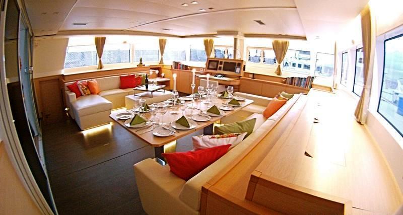 The salon is an open plan, offering plenty of seating, formal dining and an entertainment area. Guest accommodation is in the port and starboard hulls.