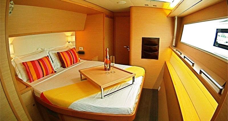 Her dark wood floors create an elegant contrast. The salon is an open plan, offering plenty of seating, formal dining and an entertainment area. Guest accommodation is in the port and starboard hulls.