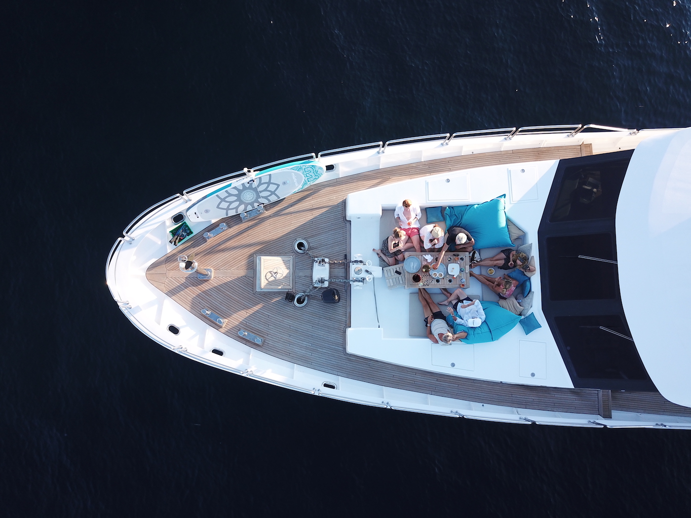 With a beam of 7.3m (23.11ft), she has ample teak decks that wrap around the yacht, giving guests easy access forward to the expansive foredeck and massive sun pad. Above the main deck, the flybridge is perfect for entertaining and has a large seating area, alfresco dining option and generous open deck space, great for sunning.