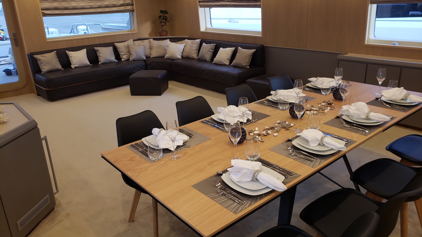 The salon and dining is an open plan. The lounge is aft with a large L shaped sofa, coffee table and entertainment system. Forward, the formal dining table seats 10 guests easily. Panoramic windows infuse the space with natural light while providing fabulous views.