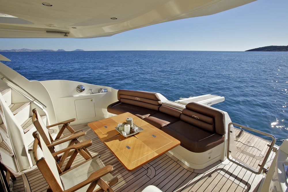 Crewed motor yacht NELL MARE offers ample exterior areas to relax. The aft deck is shaded with an alfresco dining option and additional seating, plus direct access to the salon, upper deck, foredeck and swim platform.