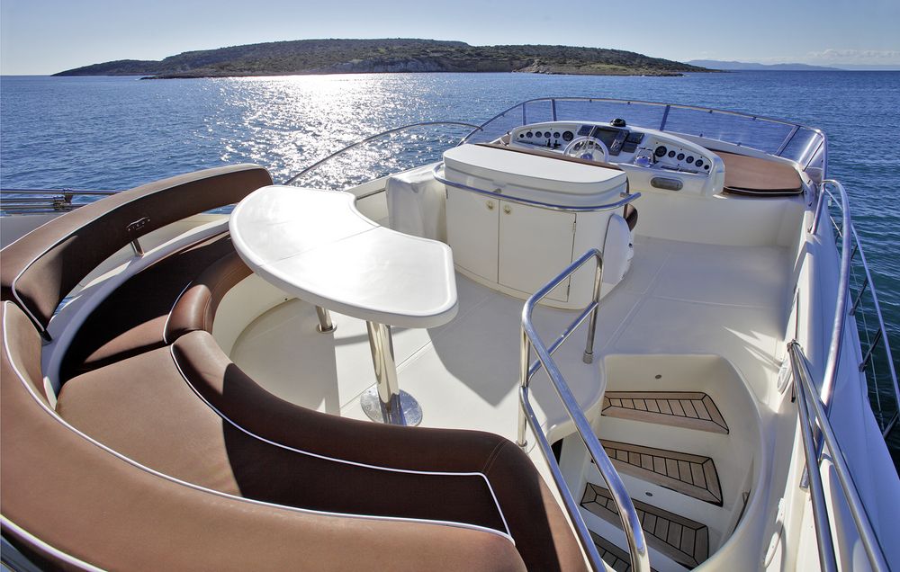 Above the main deck, the flybridge boasts a further alfresco dining option, seating and sunpads.