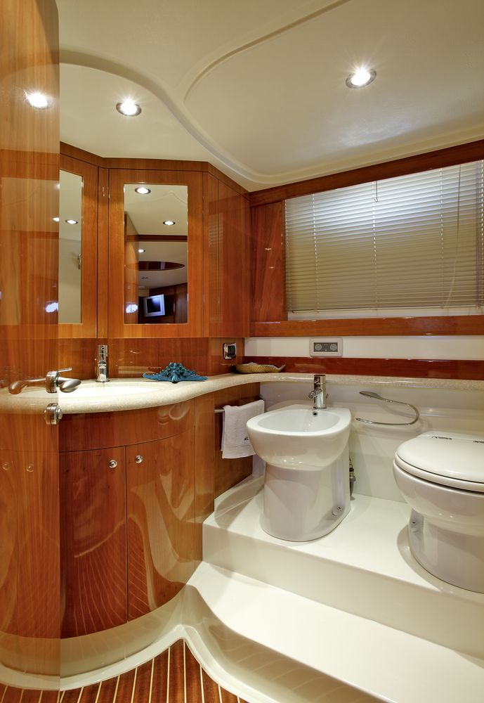 Aft, the lounge space boasts a generous sofa on the starboard side, with coffee table and full entertainment center to port. Forward, the formal dining table seats 6 guests comfortably on the port side, while an open plan galley is to starboard. Elongated side windows provide plenty of natural light and idyllic views.