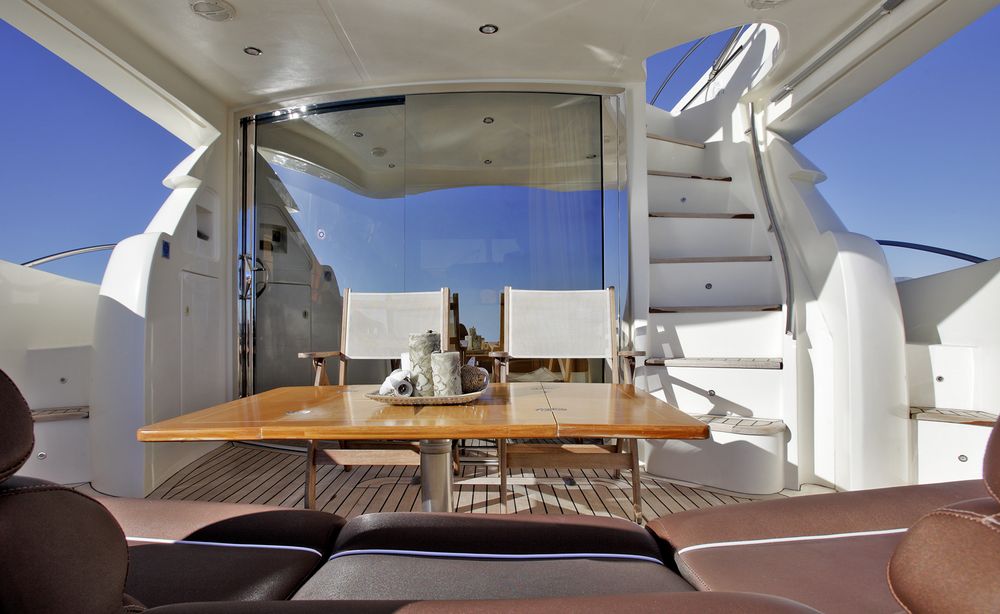 Crewed motor yacht NELL MARE offers ample exterior areas to relax. The aft deck is shaded with an alfresco dining option and additional seating, plus direct access to the salon, upper deck, foredeck and swim platform.