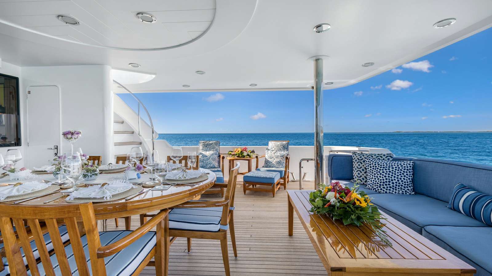The salon and dining are open plan, creating a fabulous social ambience. The lounge is aft and boasts a plush sofa, occasional chairs and a coffee table. Warm woods, neutral carpets and bespoke furnishings are highlighted by large panoramic windows and natural light. Forward, a formal dining table seats 10 charter guests with ease.