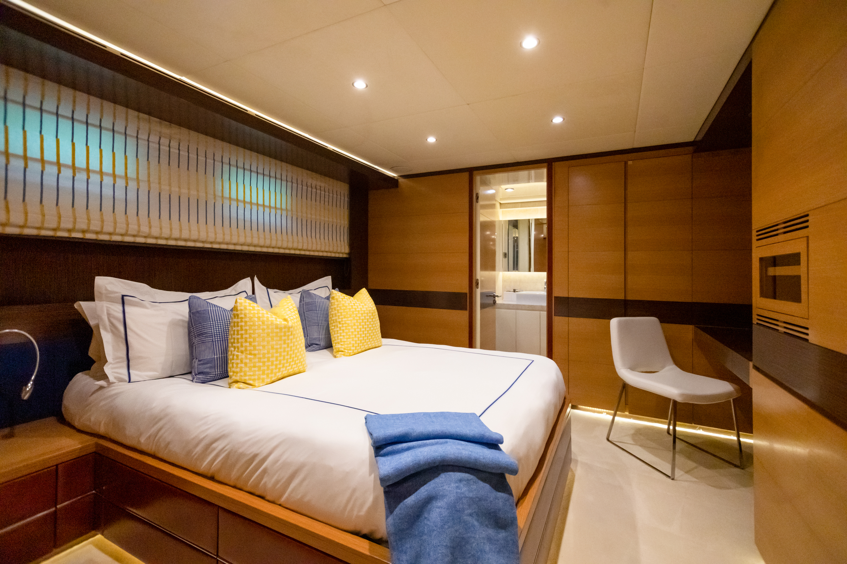 These include a full-beam master stateroom, positioned on the main deck, as well as two VIP cabins and two en suite guest cabins on the lower deck and the sixth cabin on the sky lounge.