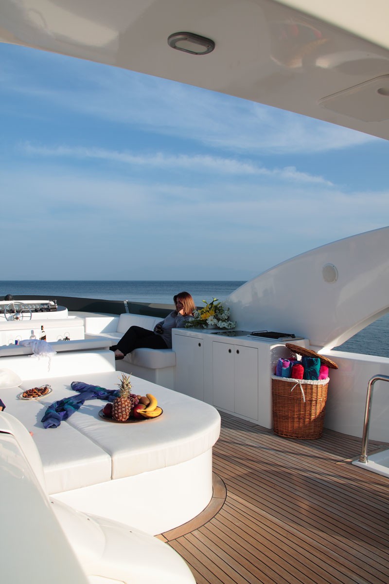 The transom boasts an extended swim platform, ideal to take advantage of the water toys on offer. The main deck wraps around the yacht 360°, providing effortless access forward. Above, the sundeck is well appointed, featuring a large sunpad, seating, wet bar, alfresco dining option and unrivaled views.