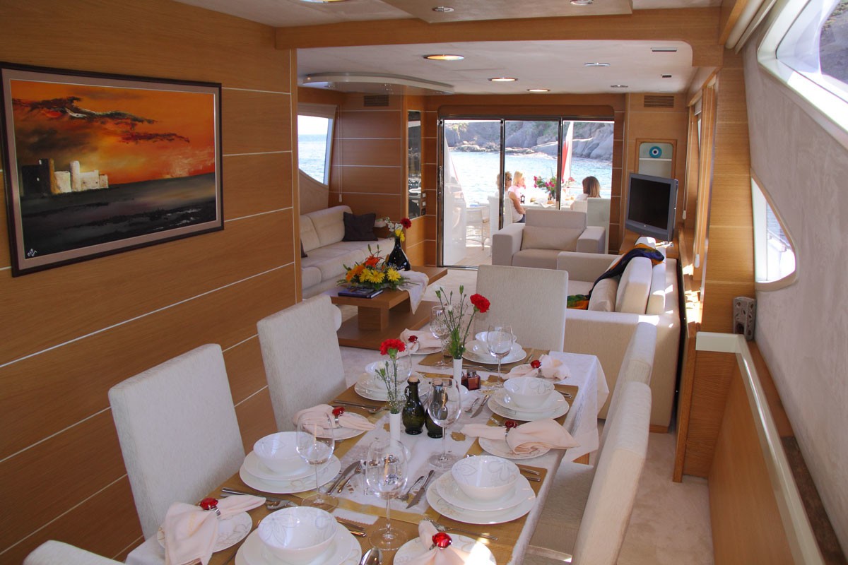 Luxury yacht SEAWIDE offers luxury accommodation for up to 8 charter guests, in 1 master, 1 VIP and 2 guest cabins. The master stateroom is full beam of the yacht, with a king size bed. The VIP cabin is forward and full beam of the yacht, with a queen size bed. Two guest cabins offer single twin beds.