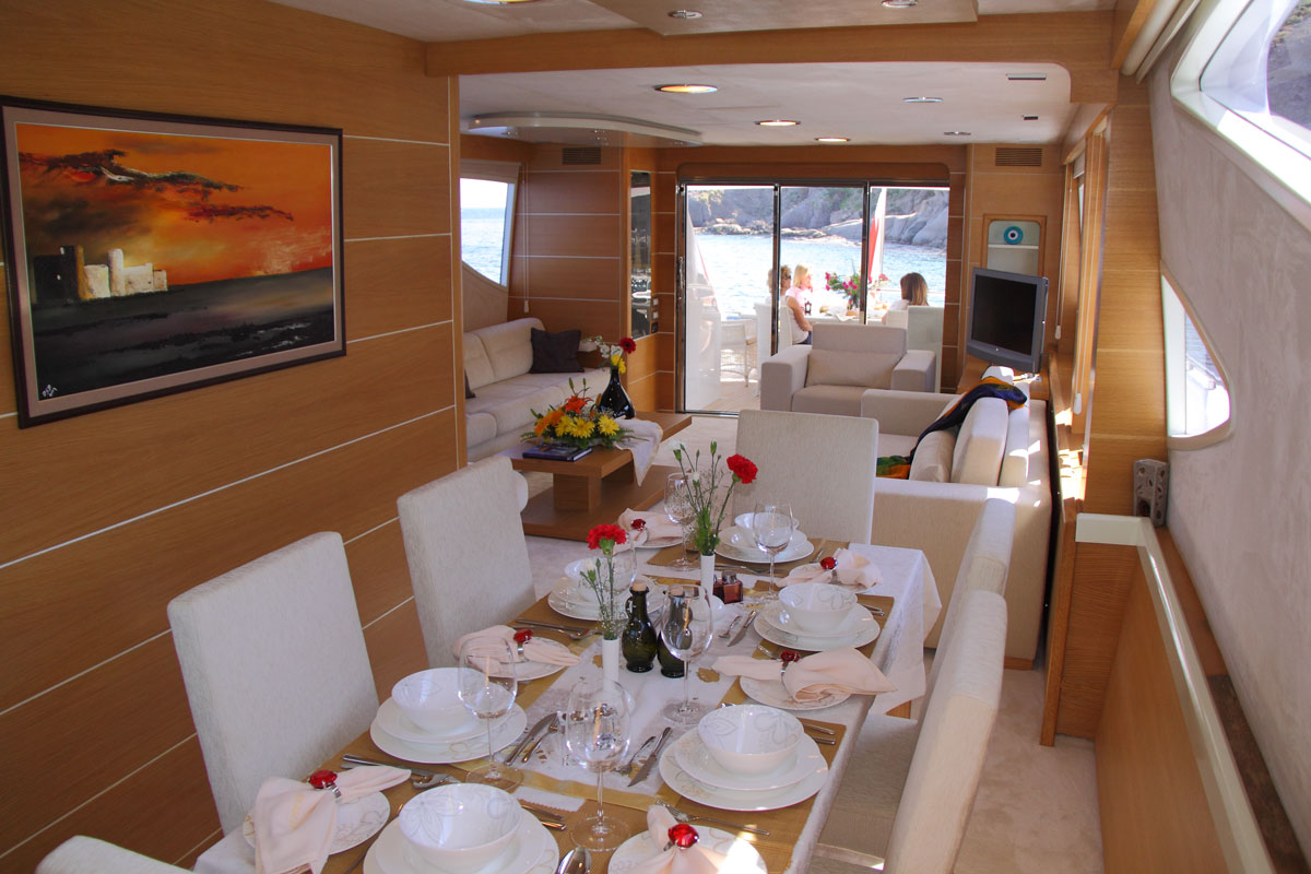 Forward of the salon lounge, is the formal dining table. With speakers fitted throughout the yacht SEAWIDE, she is a great choice for guests wishing to entertain.