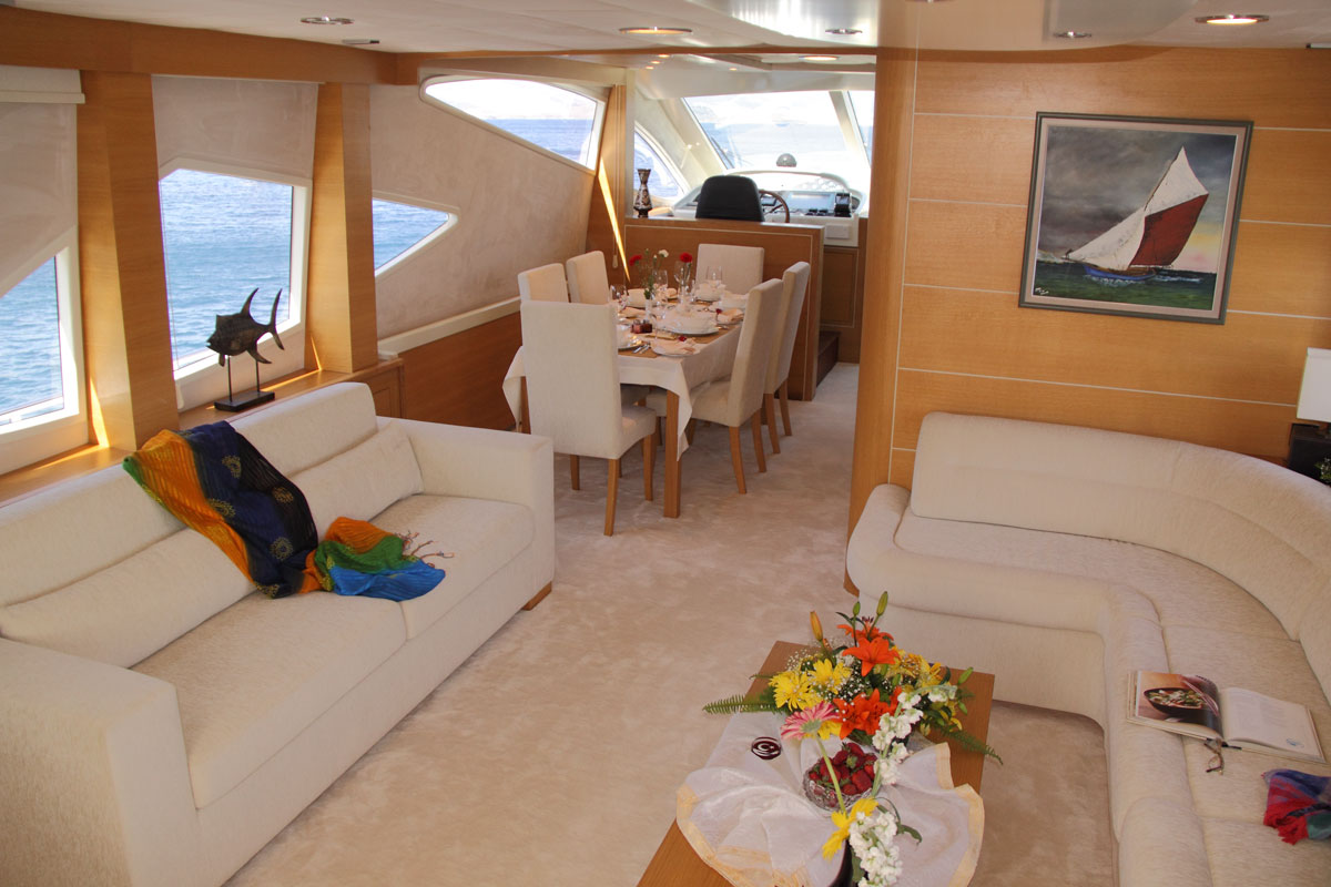 The salon is surrounded by panoramic windows, infusing the space with ample natural light. Two plush sofas, an occasional chair and coffee table, are aft atop of a deluxe pale cream carpet. Forward of the salon lounge, is the formal dining table.