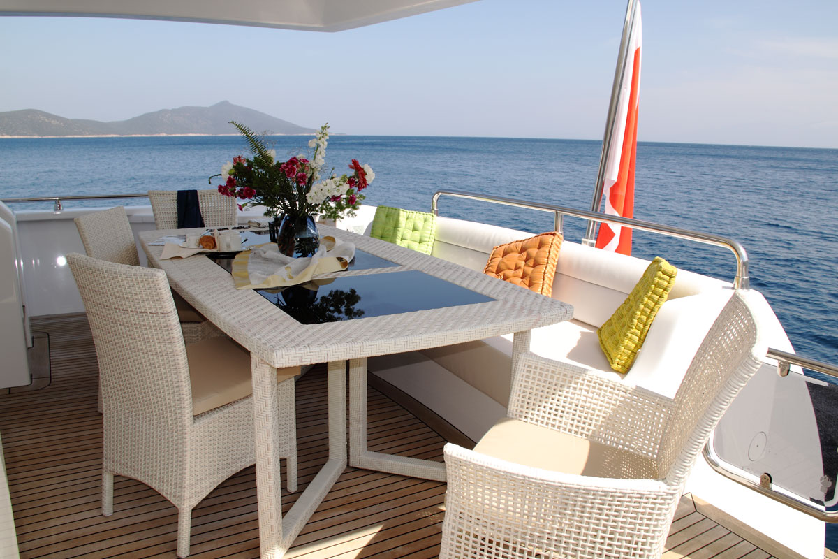 Exterior living is plentiful on the M/Y SEAWIDE’s 2 decks. On the main deck, wide sliding glass doors lead from the salon onto a generous shaded aft deck, complete with seating and an alfresco dining option. The transom boasts an extended swim platform, ideal to take advantage of the water toys on offer.