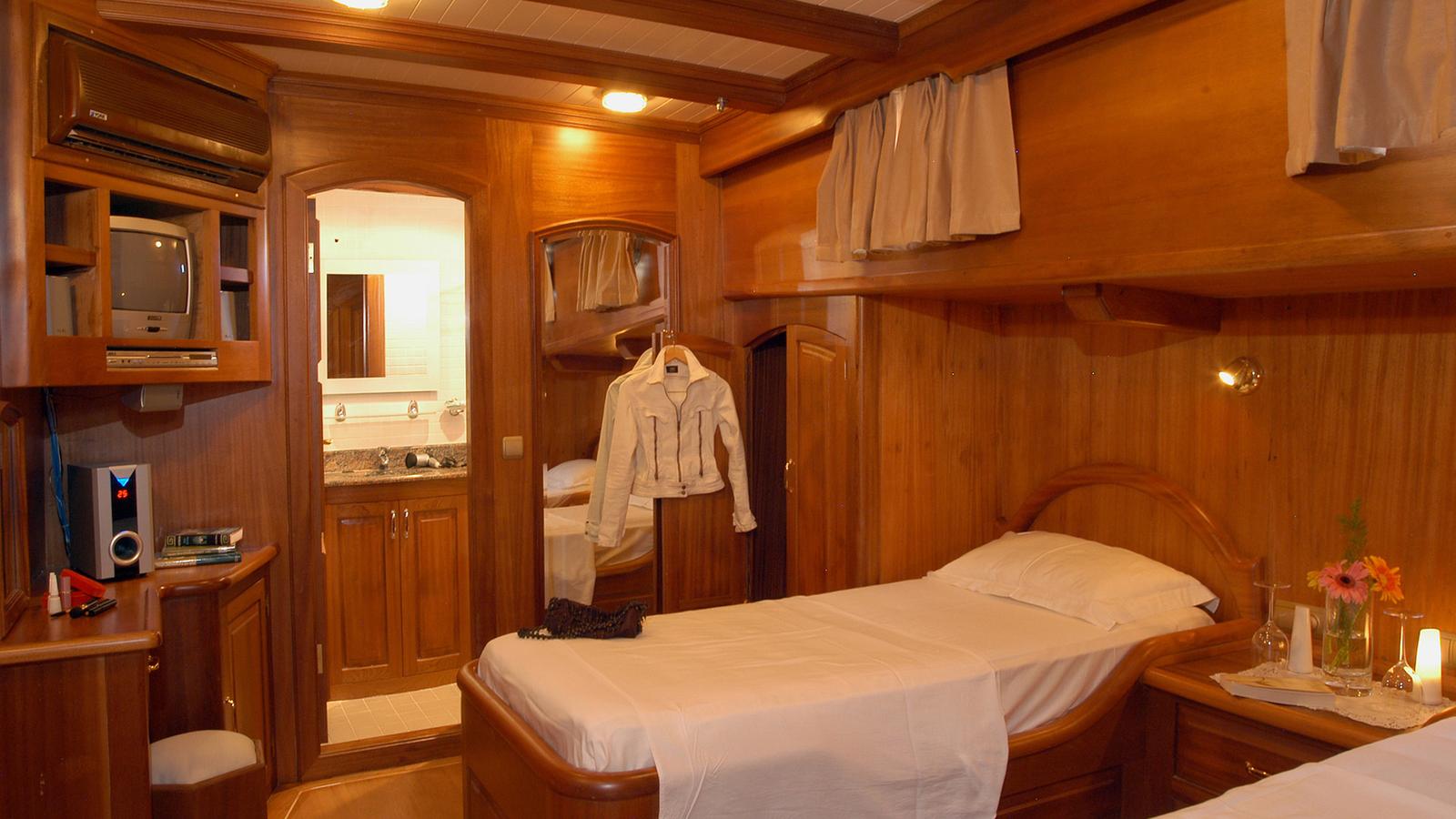 A double cabin offers a double walk around bed, while two further guest cabins each have side by side twin beds. All guest cabins are fully air-conditioned and boast TV entertainment. There is also space for a professional crew of 6 members.