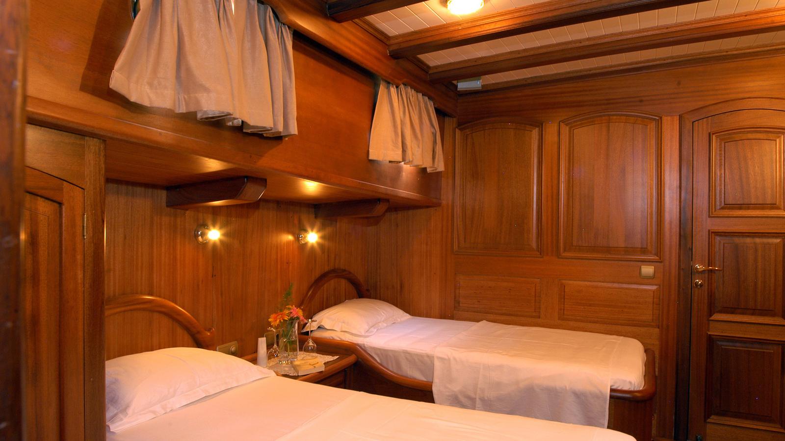 There are five lovely and comfortable cabins, including a spacious master cabin, one VIP cabin, one double cabin, as well as two twin cabins. The master cabin is aft, and full beam of the yacht, with a center, lined king size bed and comfortable lounge. The VIP cabin is forward of the yacht to port and offers a private seating area.