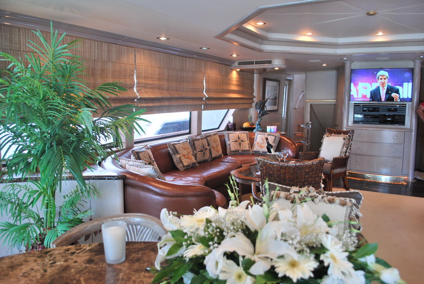 The salon and dining is an open plan, with the spacious lounge aft, including a U shaped leather sofa, coffee table, recliner chairs and a social wet bar. Forward of the salon lounge is the formal dining table, followed by a full entertainment area. Panoramic windows provide plenty of natural light and scenic vistas.