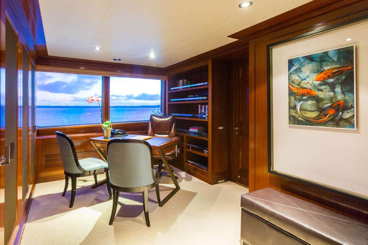 The spacious Guest Office is just forward to port of the Skylounge and features two desks with leather swivel chairs and computer. There is a dayhead located at the top of the midship stairs entering the Bridge deck.