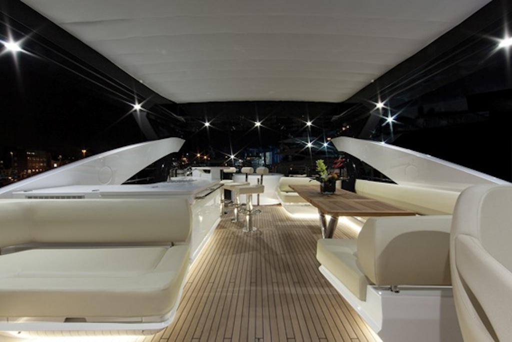 The Flybridge offers a large bar, a fridge and an ice maker, a Kenyon BBQ grill as well as a possibility for dining for 8 guests. There is also a large sunbathing pad forward. The area is covered with a hard top with a retractable inner canopy and aft sun awning.