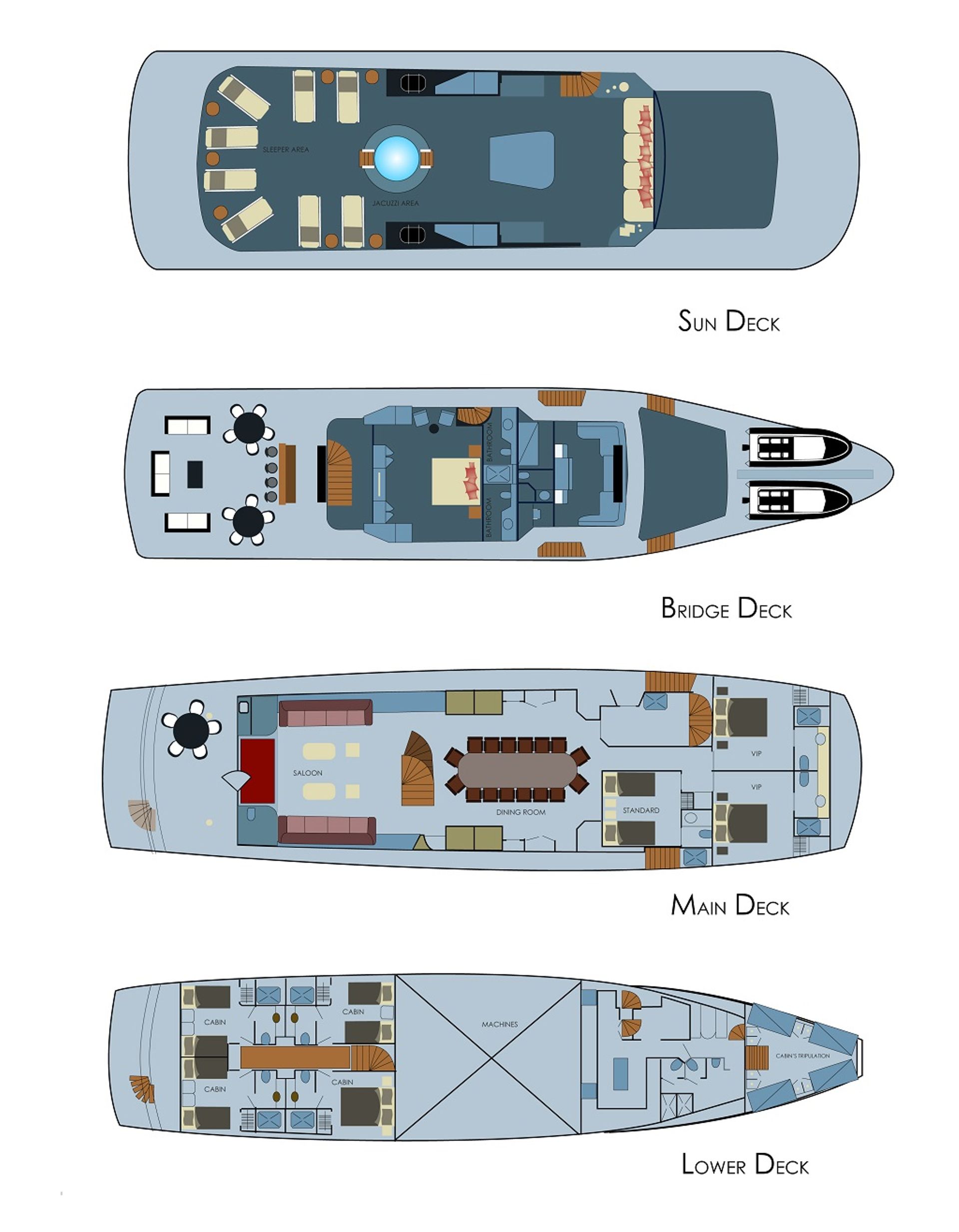 On the bridge deck is the master suite, offering a full beam layout, king size bed, desk, sofa and direct upper aft deck access. On the main deck are 2 VIP cabins and 1 twin cabin. Below decks are one double cabin and 3 twin cabins. All guest cabins are fully air conditioned and offer private en-suite facilities.