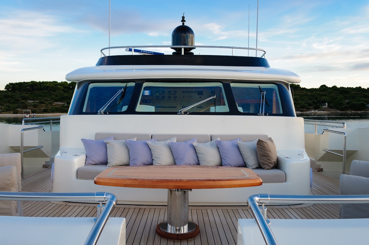 NOVELA offers ideal exterior living, to make the most of the sunny and warm destinations. The salon leads out through sliding glass doors onto a spacious aft deck, with plush cocktail seating and convertible tables, allowing for casual entertaining or elegant alfresco dining.