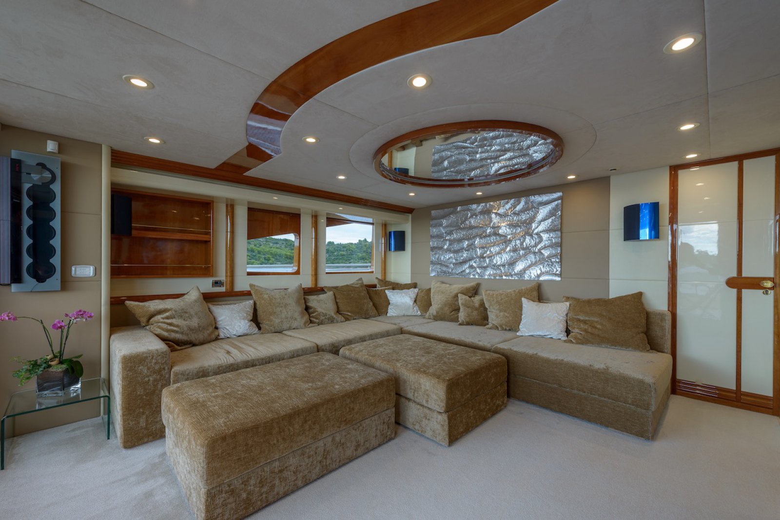 The salon is on the main deck with a large sofa, coffee table and occasional chairs, in a sumptuous crushed velvet texture, a Grand Piano exudes a classy ambience. Forward and separated by custom engraved glass art, is the formal dining area.