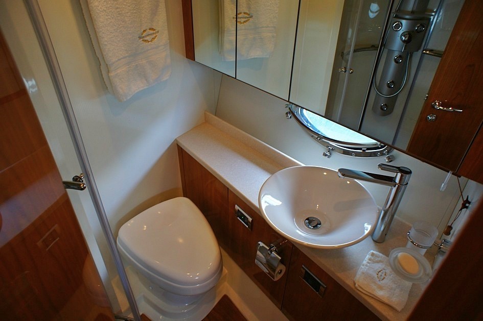 Her dark blue planing hull and white super structure will be sure to turn heads as you wiz by. Luxury charter crewed charter yacht SAINT GEORGE offers 3 cabins for up to 6 guests. The master suite is aft and full beam of the yacht, with a double bed and vanity, large hull windows allow ample natural light and scenic views.
