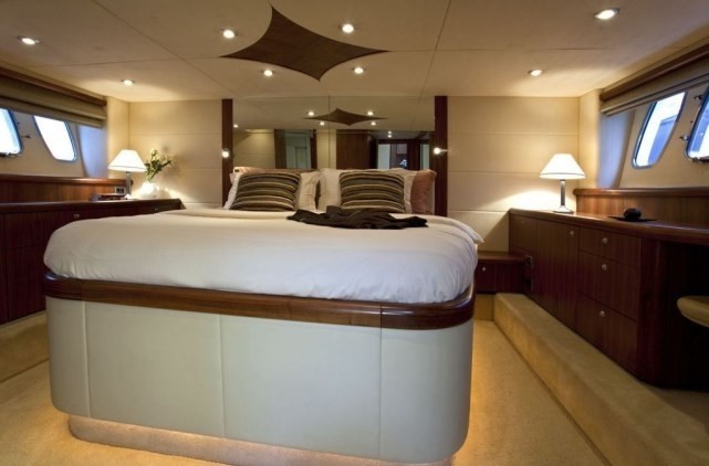 Luxury charter crewed charter yacht SAINT GEORGE offers 3 cabins for up to 6 guests. The master suite is aft and full beam of the yacht, with a double bed and vanity, large hull windows allow ample natural light and scenic views. The VIP cabin is forward and full beam of the yacht, with a center lined double bed.