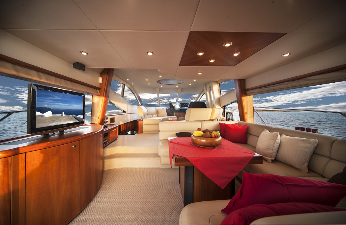 The salon and dining is an integrated plan, featuring a comfortable lounge and formal dining area, with a full entertainment system opposite. Forward of the salon, is a further seating area and the main helm station.