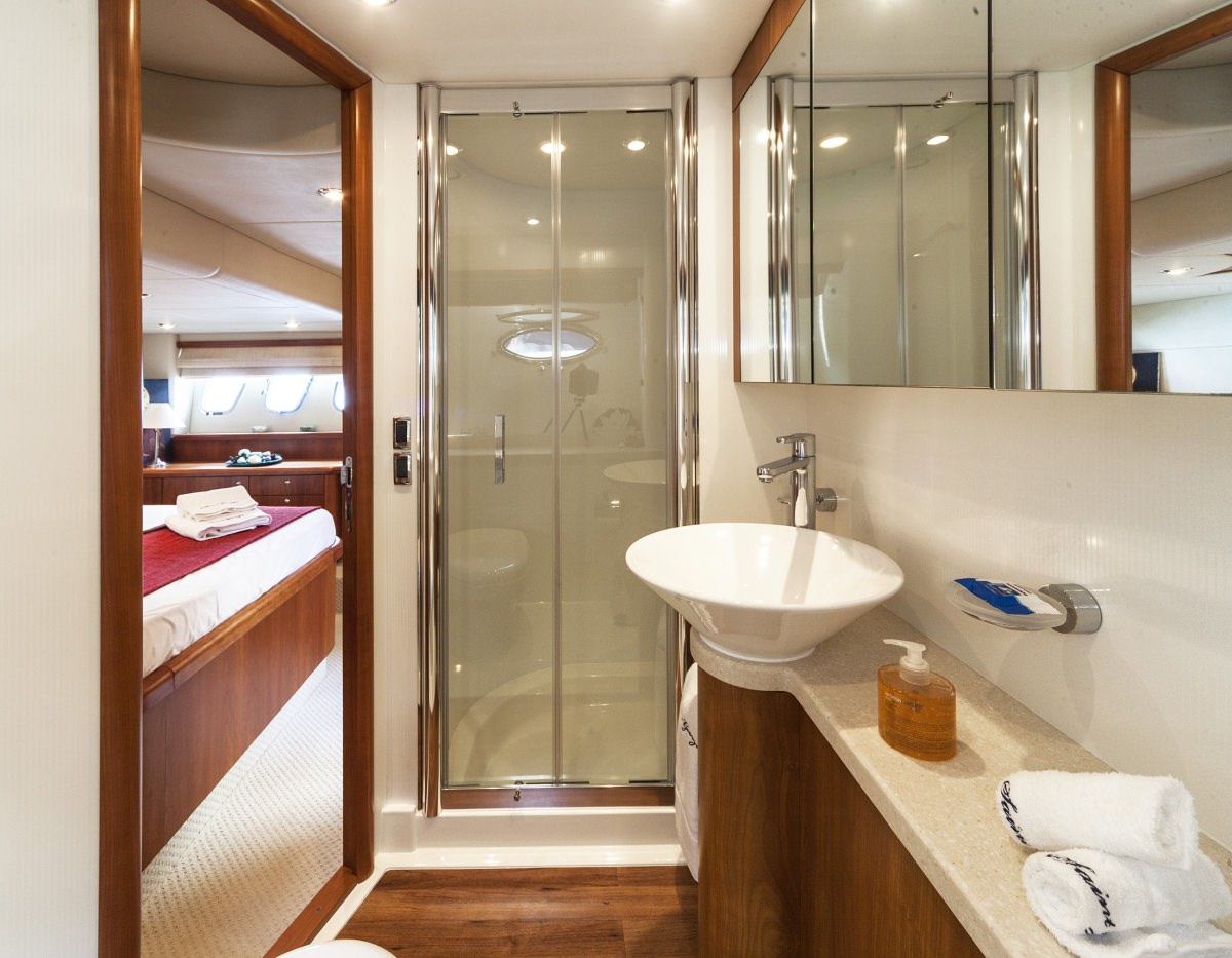 The salon and dining is an integrated plan, featuring a comfortable lounge and formal dining area, with a full entertainment system opposite. Forward of the salon, is a further seating area and the main helm station.
