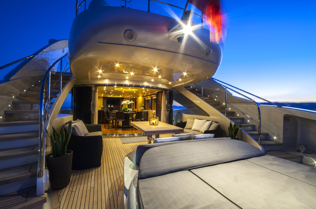 M/Y PETRA’S sleek hull boasts 2 decks and ample exterior living. The aft deck is adjacent to the salon through wide sliding glass doors, fabulous for interior to exterior entertaining. The aft deck features an alfresco dining area, seating and large double sunpad.