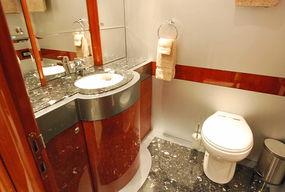 The salon and dining is an open plan with the lounge aft and formal dining forward. The lounge offers a large curved sofa and coffee table to starboard, with a pop up entertainment center to port. The formal dining table offers seating for 6 charter guests.