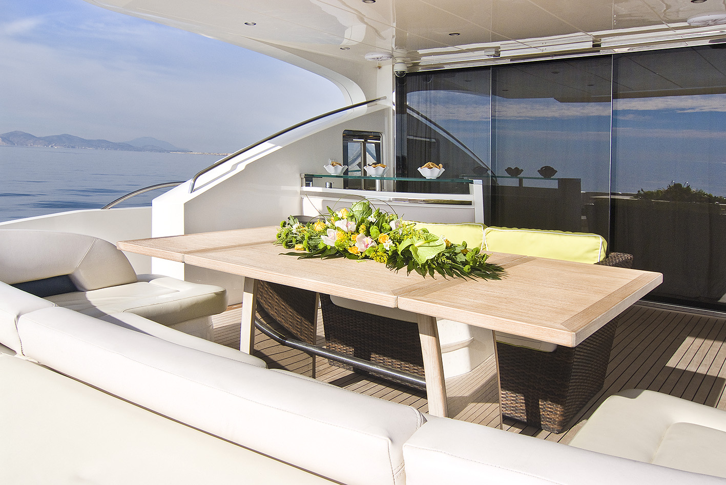 M/Y CATHERINE has a large partially shaded aft deck, complete with lounge seating, sunpad and an alfresco dining option. A generous foredeck boasts a further alfresco dining area and double sunpad. The upper deck offers plenty of seating and optional shade.