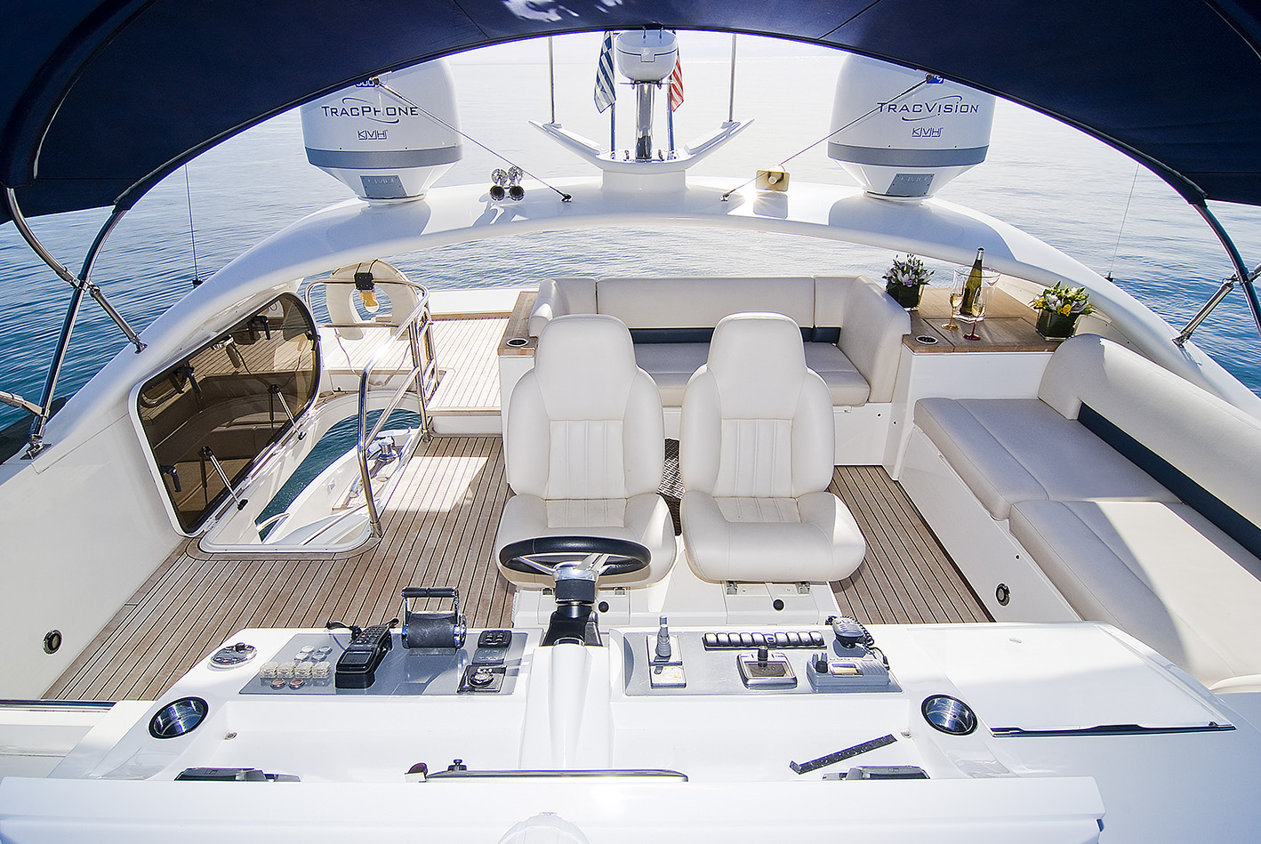 A generous foredeck boasts a further alfresco dining area and double sunpad. The upper deck offers plenty of seating and optional shade. For the water enthusiasts, the full beam extended swim platform makes water activities effortless.