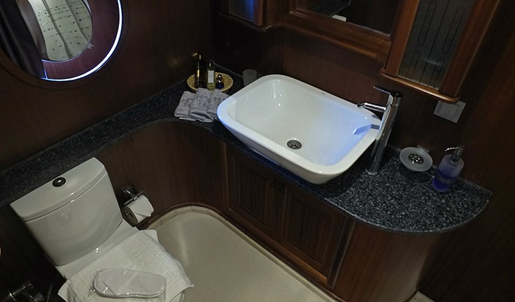 Each cabin is provided with good-quality materials, furnishings, air-conditioning and mosaic en suite bathrooms with granite countertops for a pleasant and relaxing stay on board.
