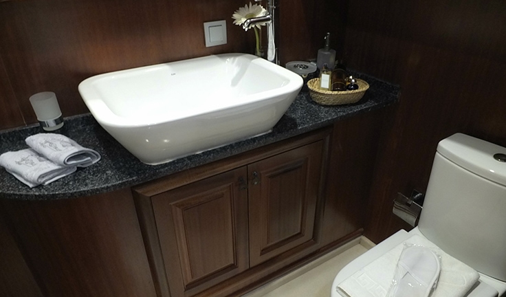 Each cabin is provided with good-quality materials, furnishings, air-conditioning and mosaic en suite bathrooms with granite countertops for a pleasant and relaxing stay on board.