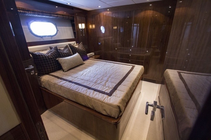 Surrounding panoramic windows allow ample natural light and fabulous views. A foyer to starboard passes steps to the upper bridge deck, and onto a full beam country style galley, offering an additional more casual dining space.