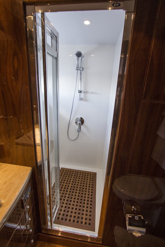 The master suite is amidships, providing a centre lined king size bed and his and hers toilets. The VIP cabin is forward, with a centre lined queen size bed. A further two guest cabins consist of one double and one twin cabin, each with private en-suite facilities.