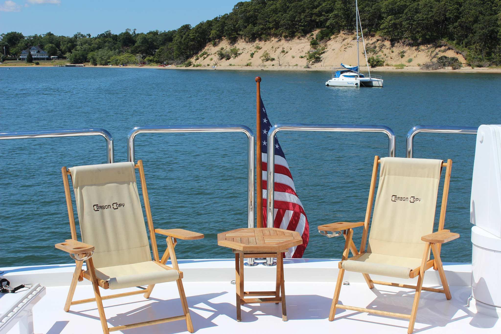 Further aft, teak chairs and a cocktail table are the ideal places to sit back and soak up the sun in style.