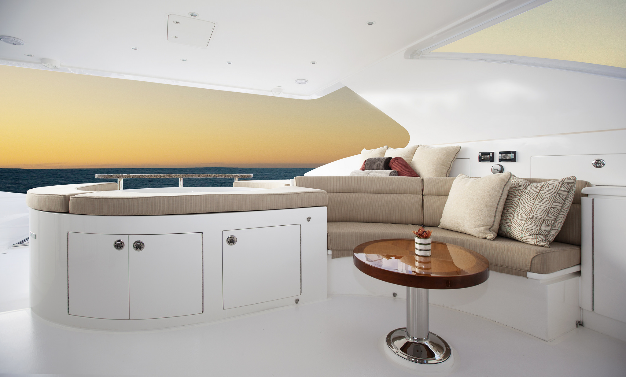 Exterior living aboard the Hargrave yacht is spacious. The aft deck is adjacent to the main salon boasting a shaded alfresco dining table and plenty of seating, perfect for socialising and relaxing. An extended swim platform on the transom ensures effortless water access to the good array of sea toys on offer.