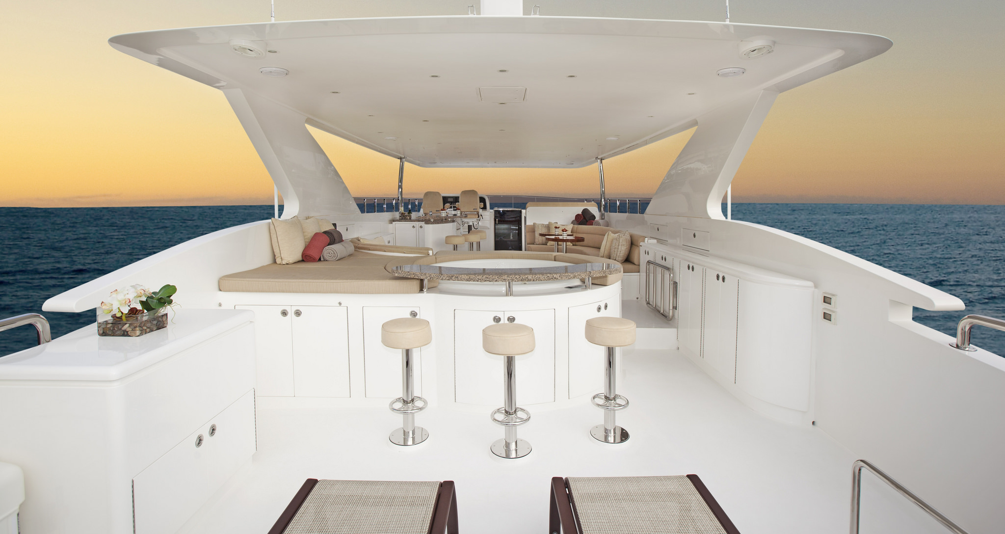 Exterior living aboard the Hargrave yacht is spacious. The aft deck is adjacent to the main salon boasting a shaded alfresco dining table and plenty of seating, perfect for socialising and relaxing. An extended swim platform on the transom ensures effortless water access to the good array of sea toys on offer.