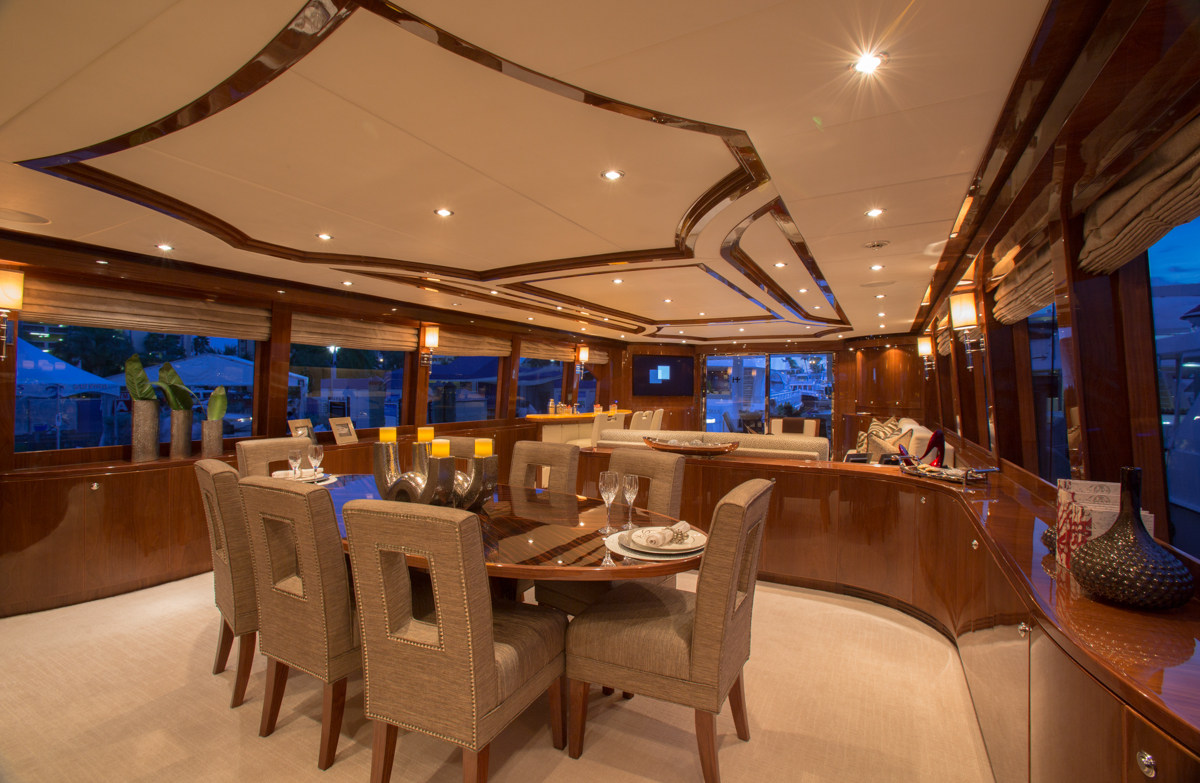 Forward of the salon in an open plan, is the formal dining table. Surrounding panoramic windows allow ample natural light and fabulous views. A foyer to starboard passes steps to the upper bridge deck, and onto a full beam country style galley, offering an additional more casual dining space.